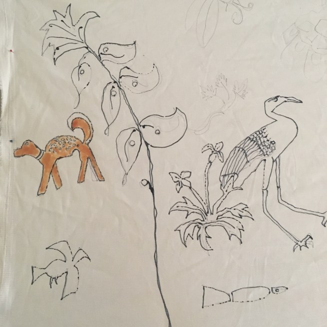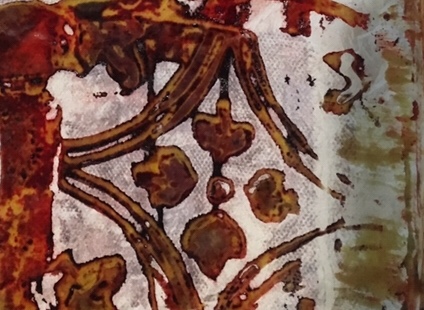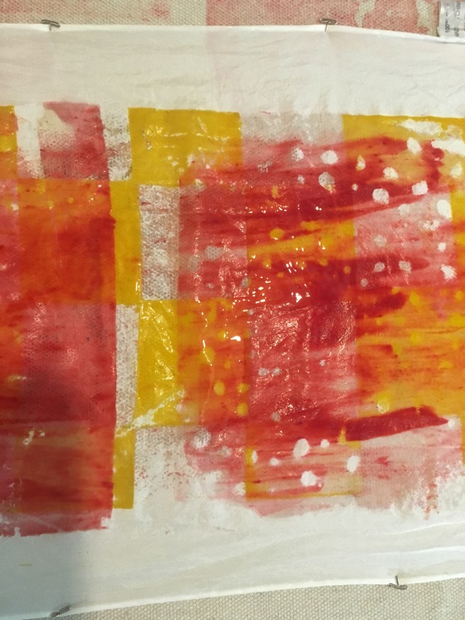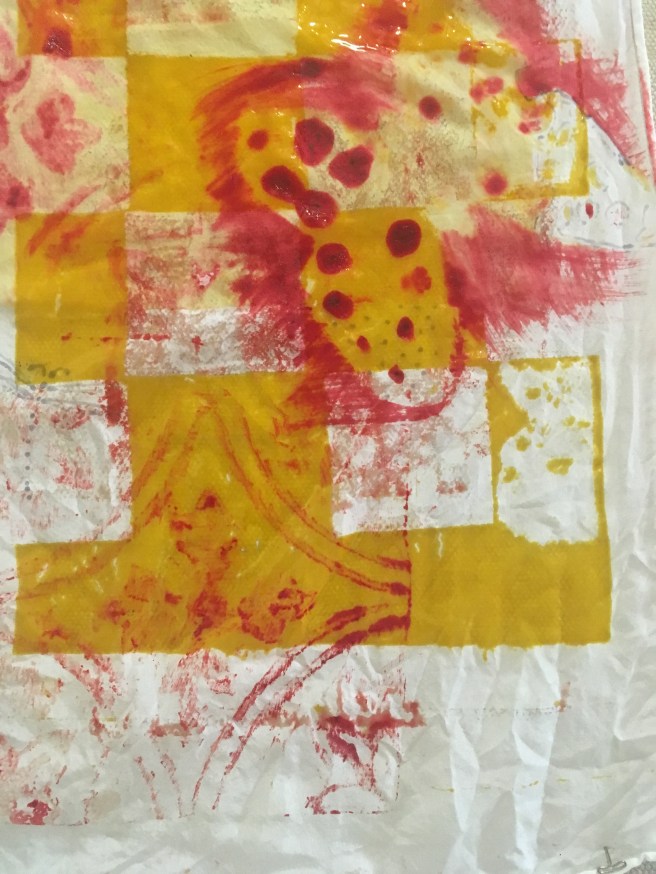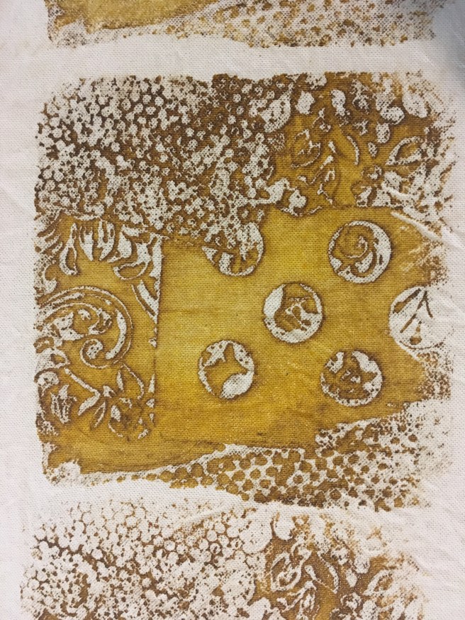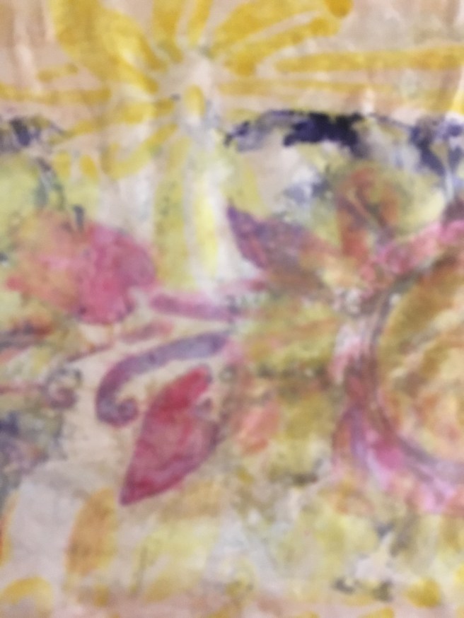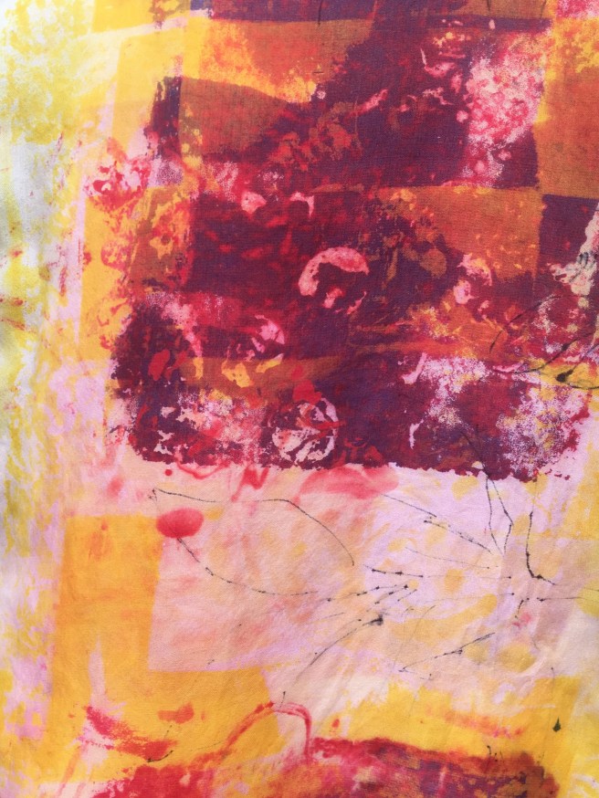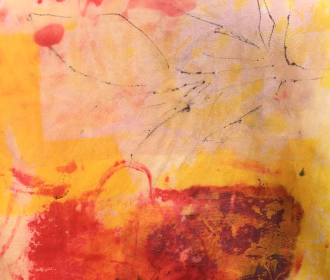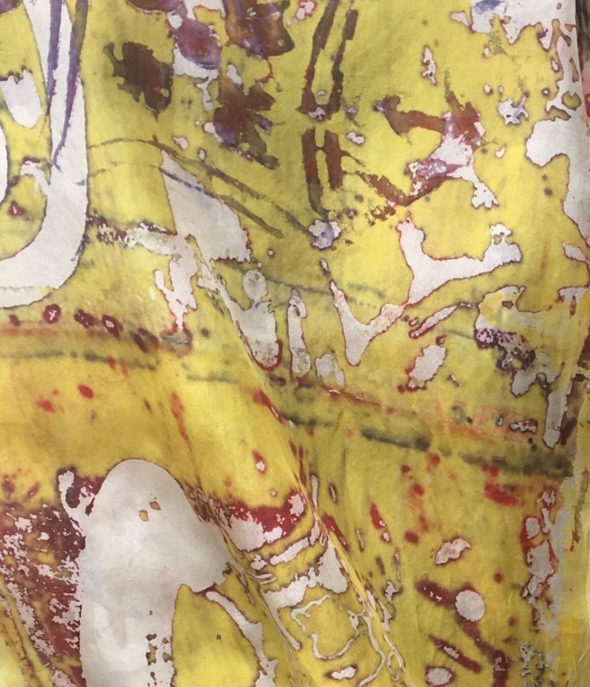 This is printing on fabric…it’s called breakdown printing or deconstruction printing. I am having so much fun working with it. When I’m printing/ painting work l it feels like I’m flying. I just started using the paste in a little plastic bottle with a point. I started at one corner and just went around the whole piece almost like hieroglyphics or stream of consciousness in one setting. Any one else experience this while working?